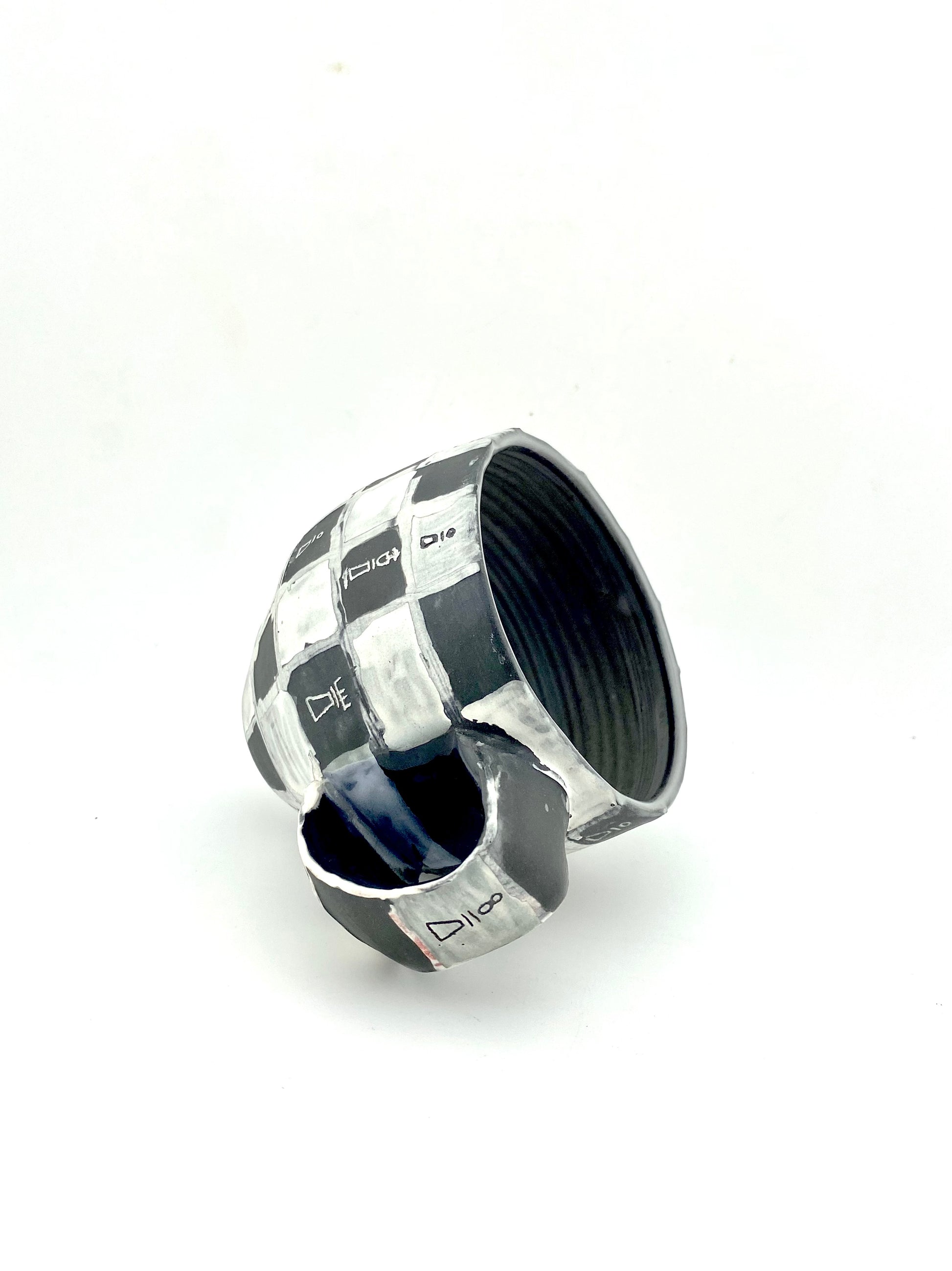 black porcelain mug water etched and carved with chess designs. interior glazed, exterior unglazed and sanded smooth.