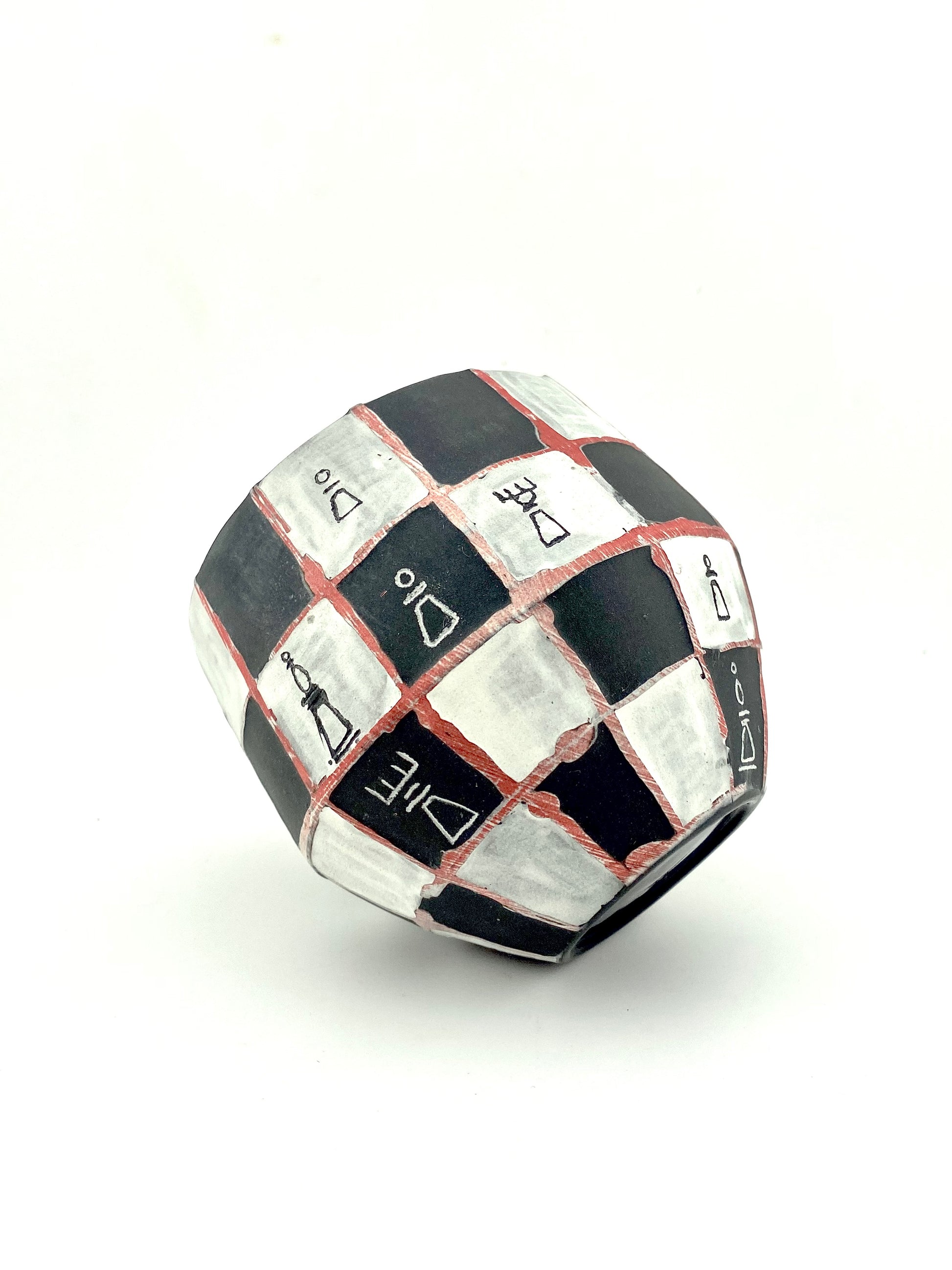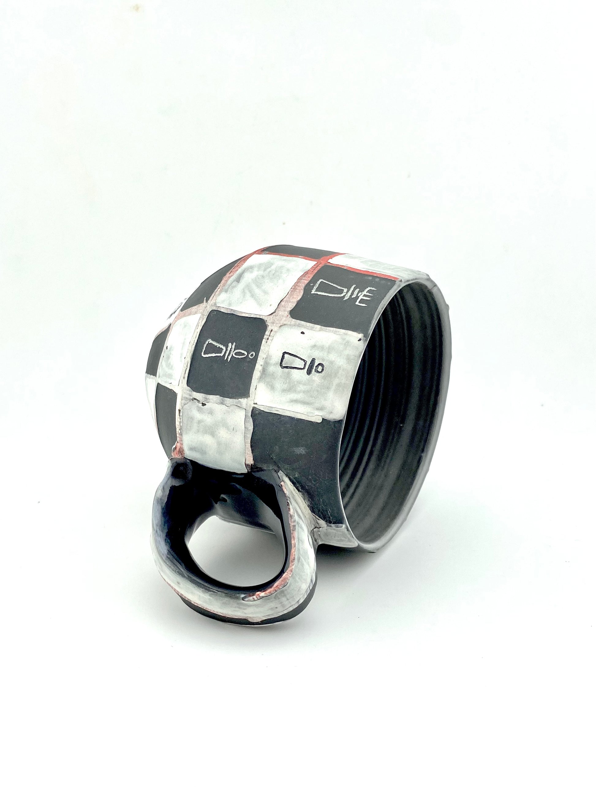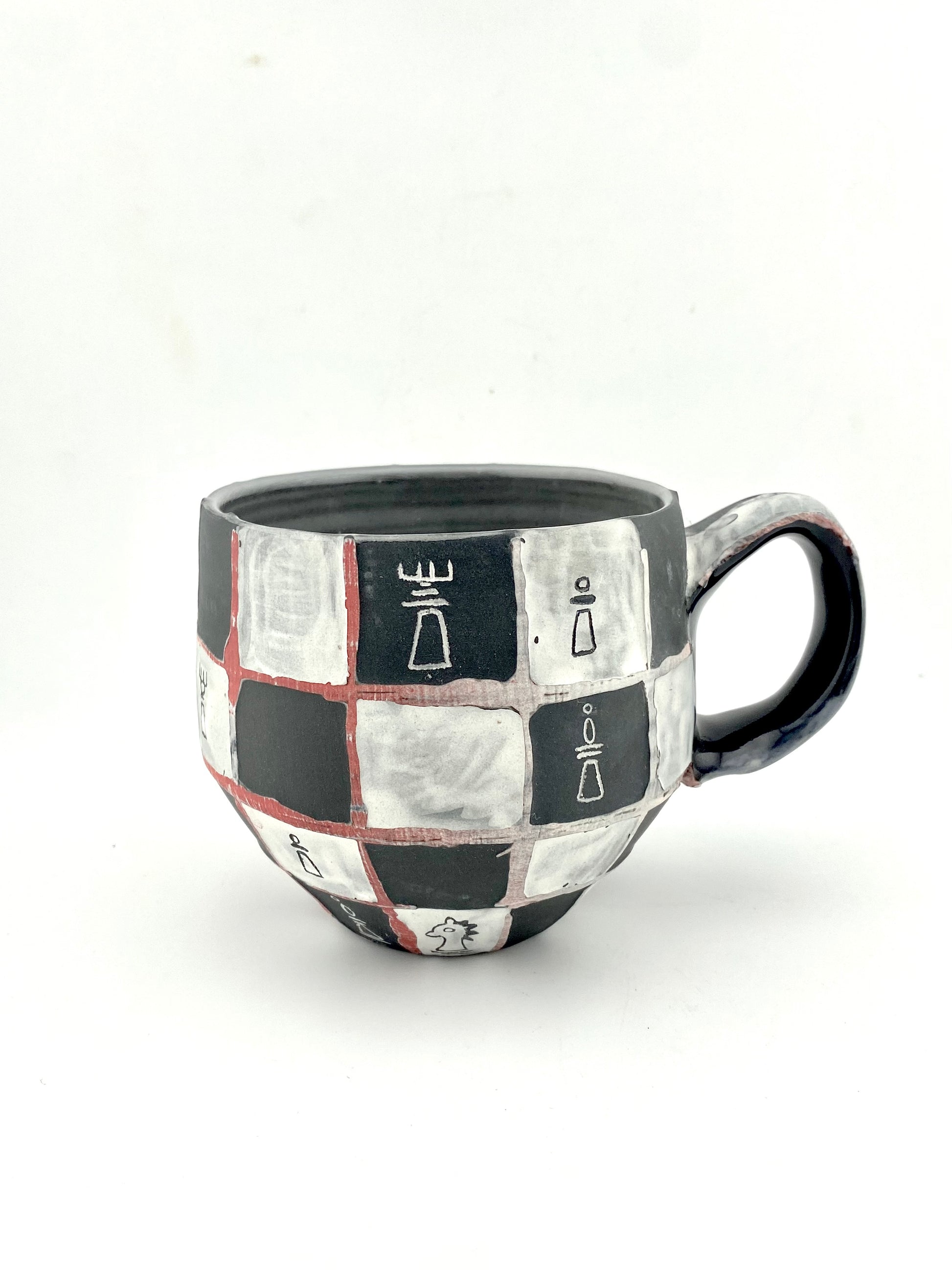black porcelain mug water etched and carved with chess designs. interior glazed, exterior unglazed and sanded smooth.