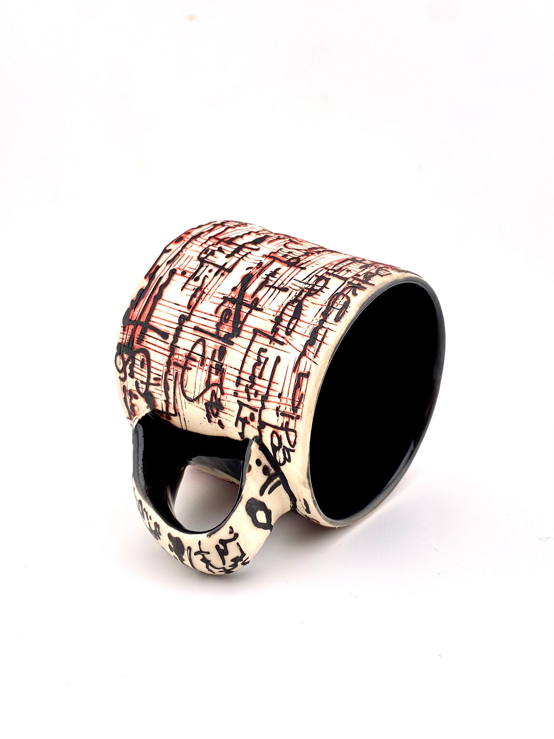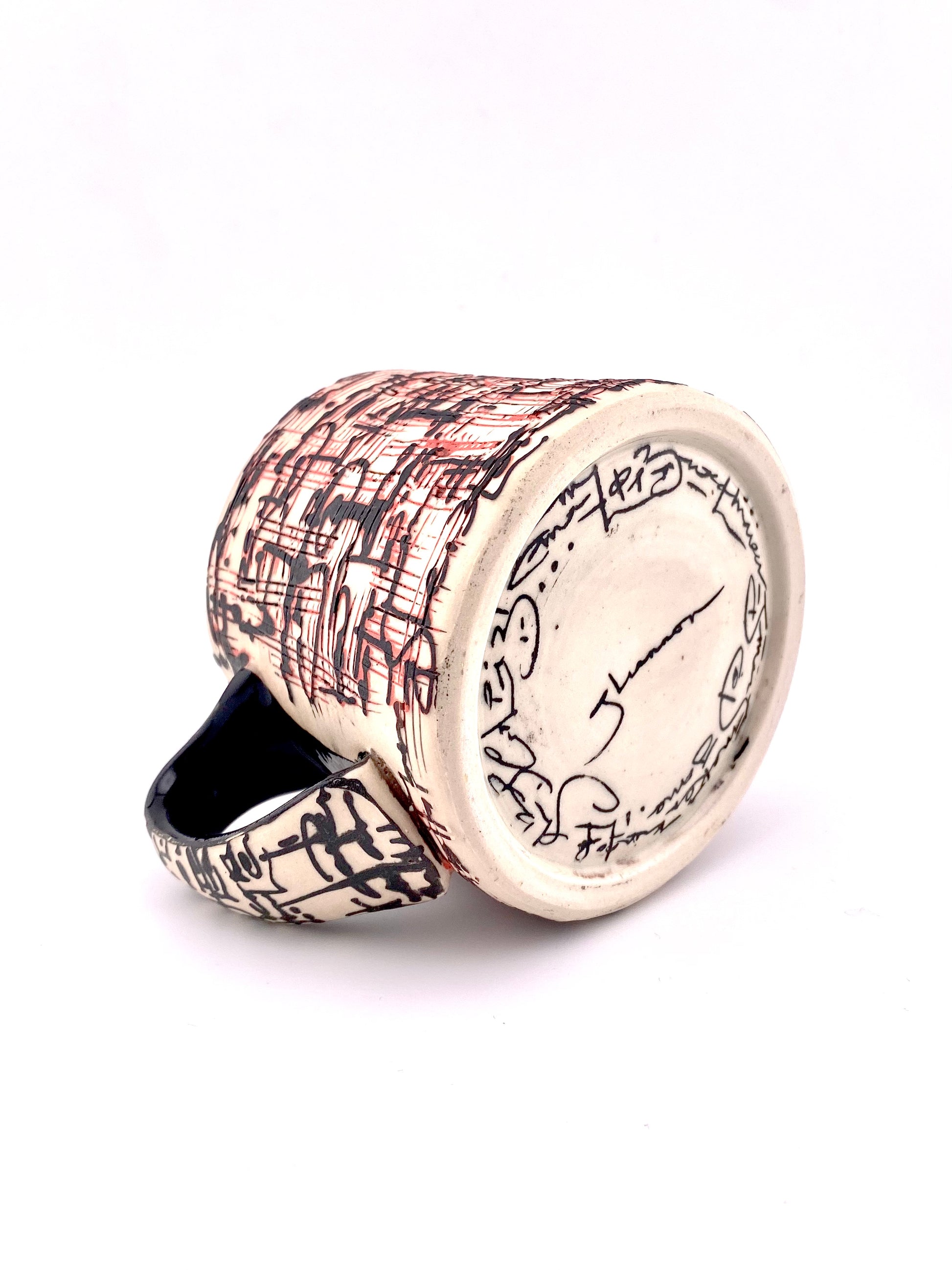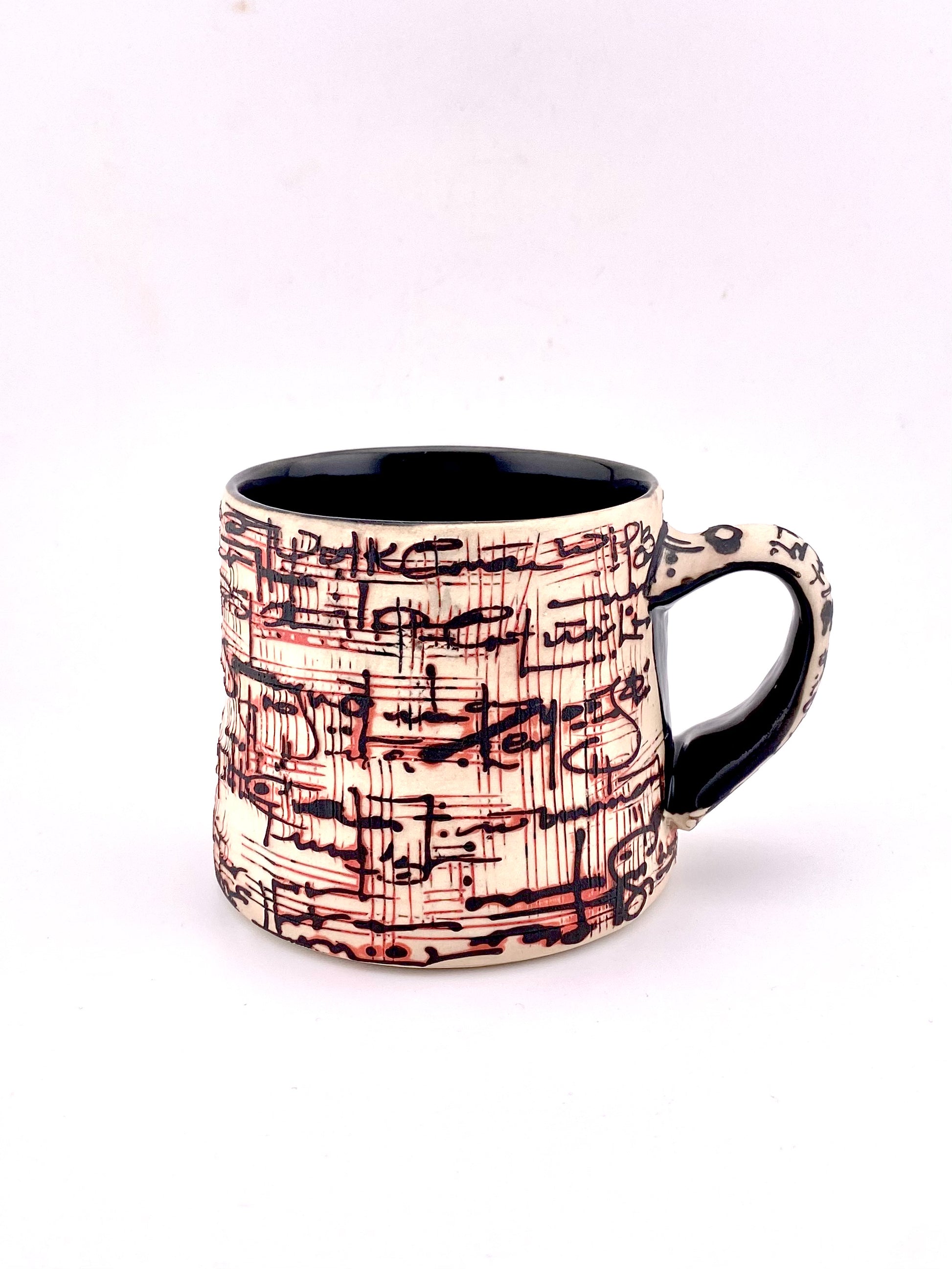 porcelain mug water carved with textured script details. interior glazed, exterior unglazed and sanded smooth.