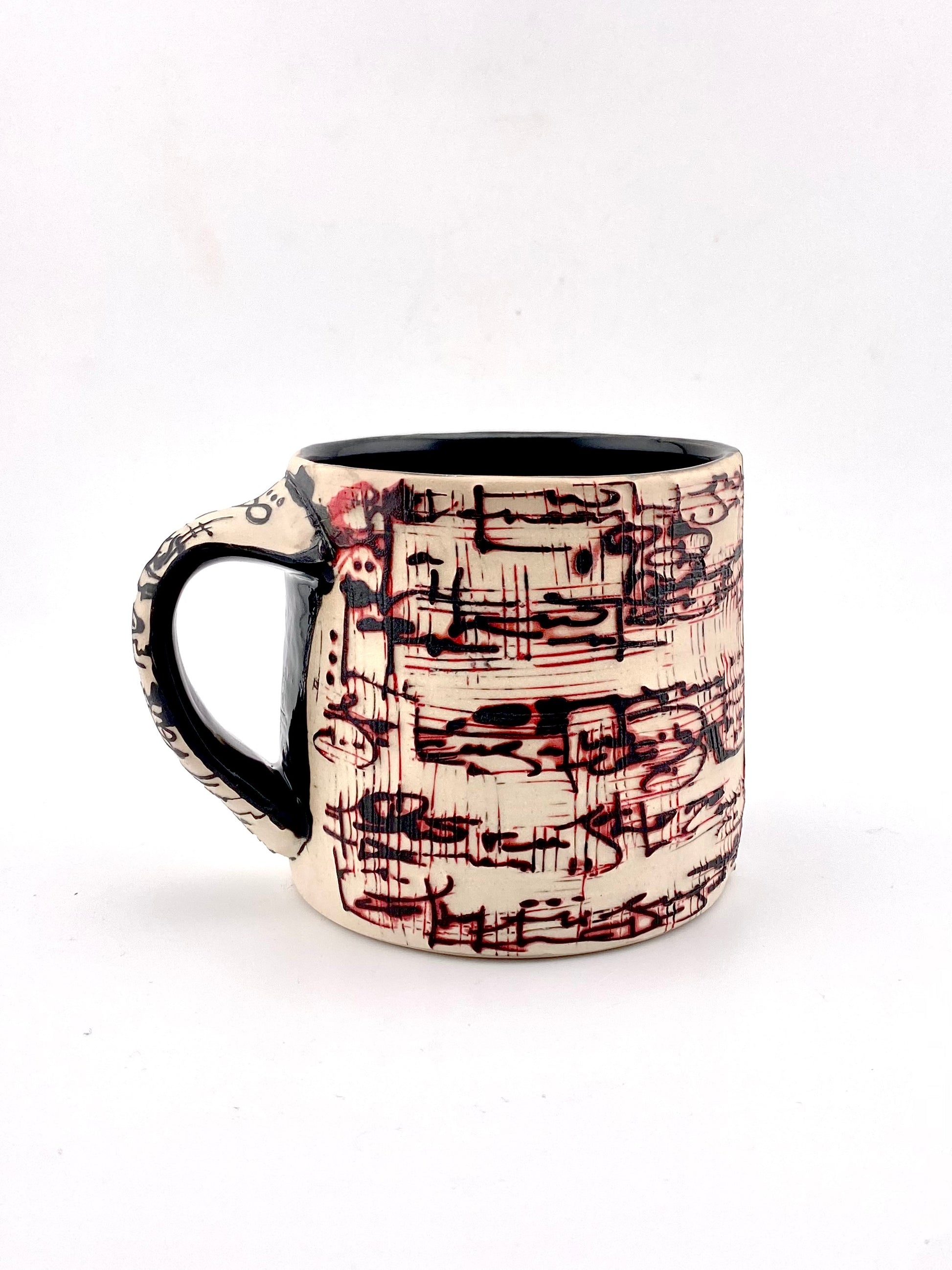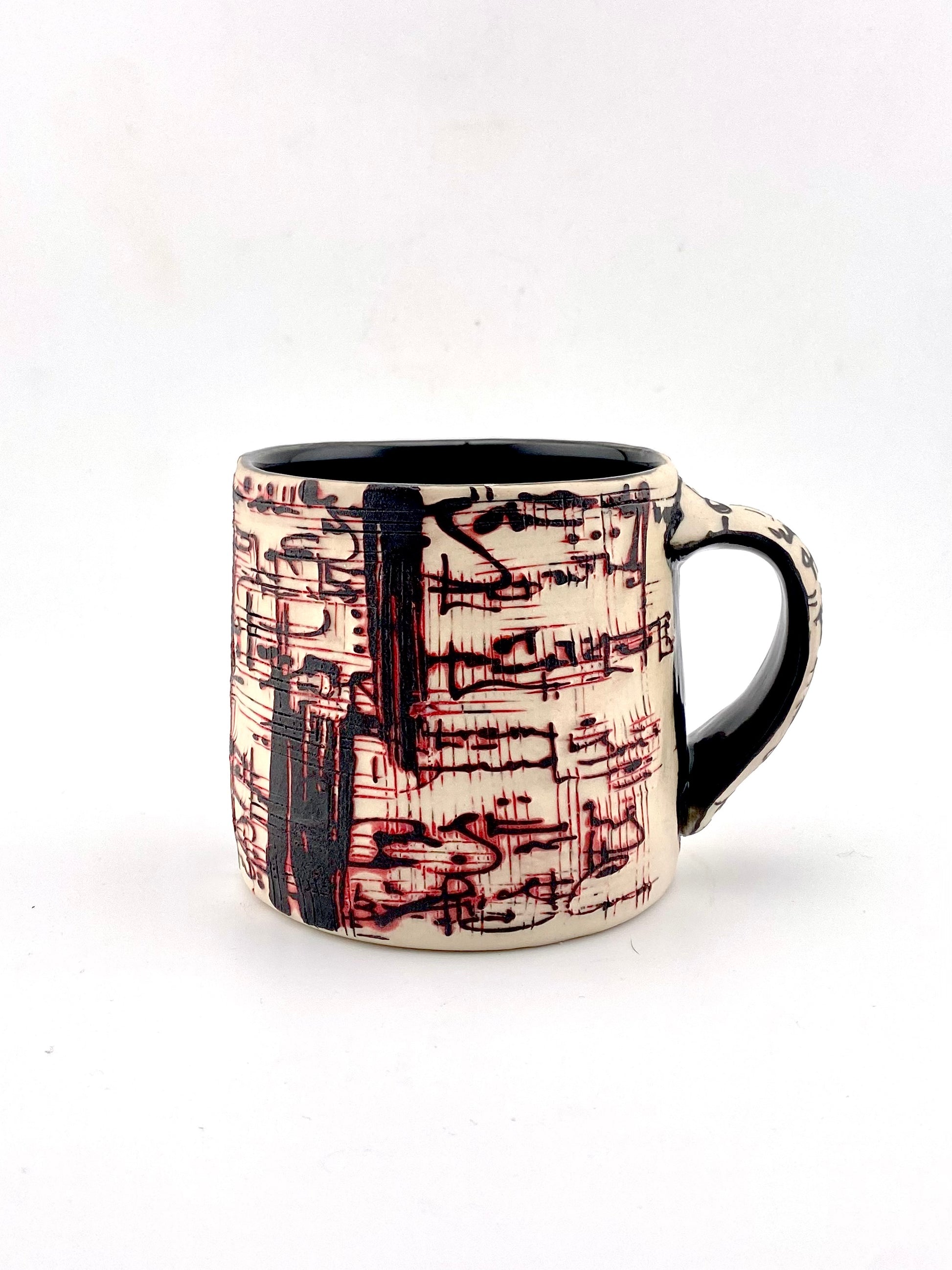 porcelain mug water carved with textured script details. interior glazed, exterior unglazed and sanded smooth.