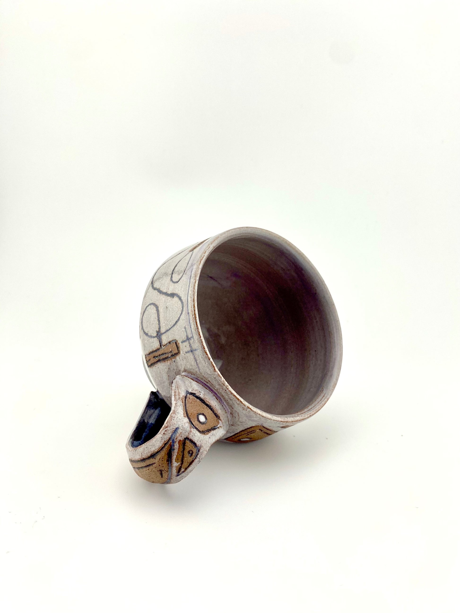 stoneware mug decorated with pottery tool designs. interior and partial exterior glazed lilac.