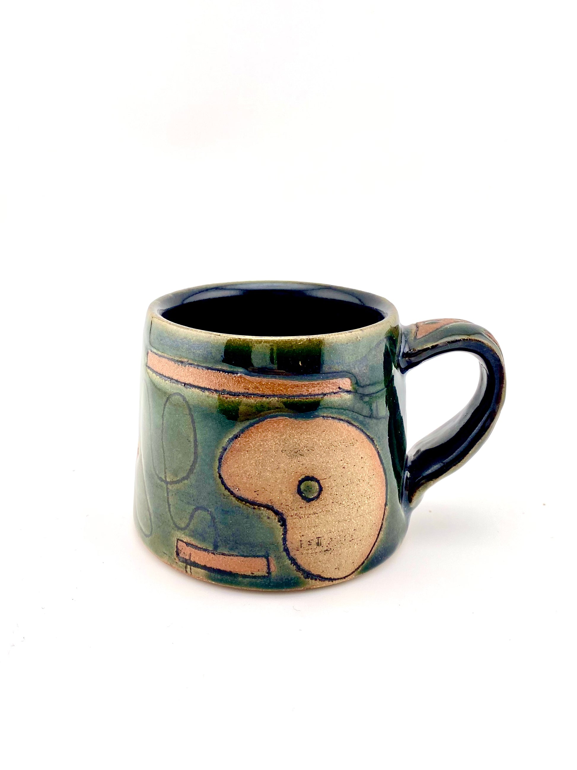 stoneware mug decorated with pottery tool designs. interior and partial exterior glazed lilac.