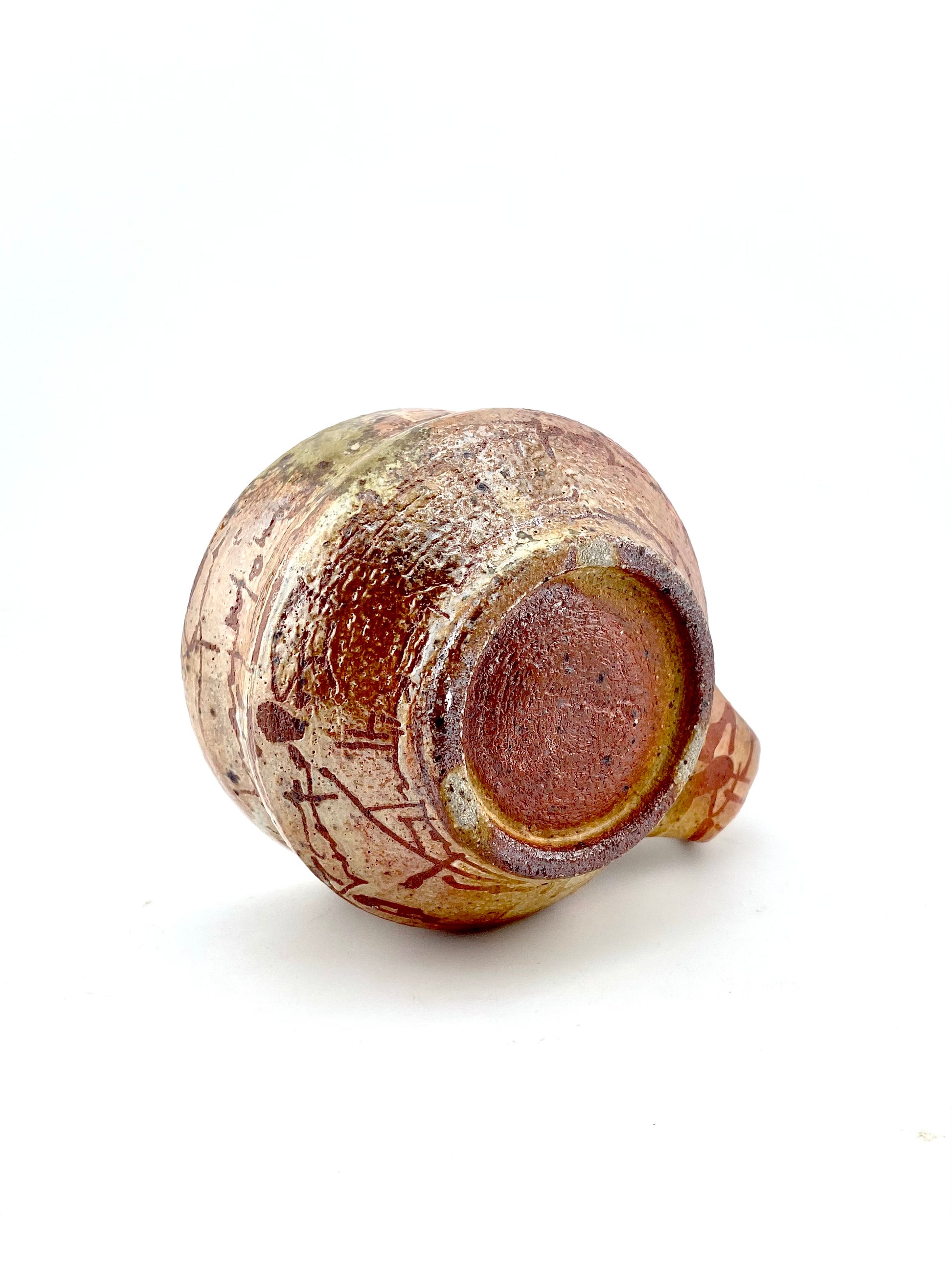 stoneware mug decorated with beeswax and layered flashing slips. interior glazed, exterior unglazed and finished in wood kiln, then sanded smooth.