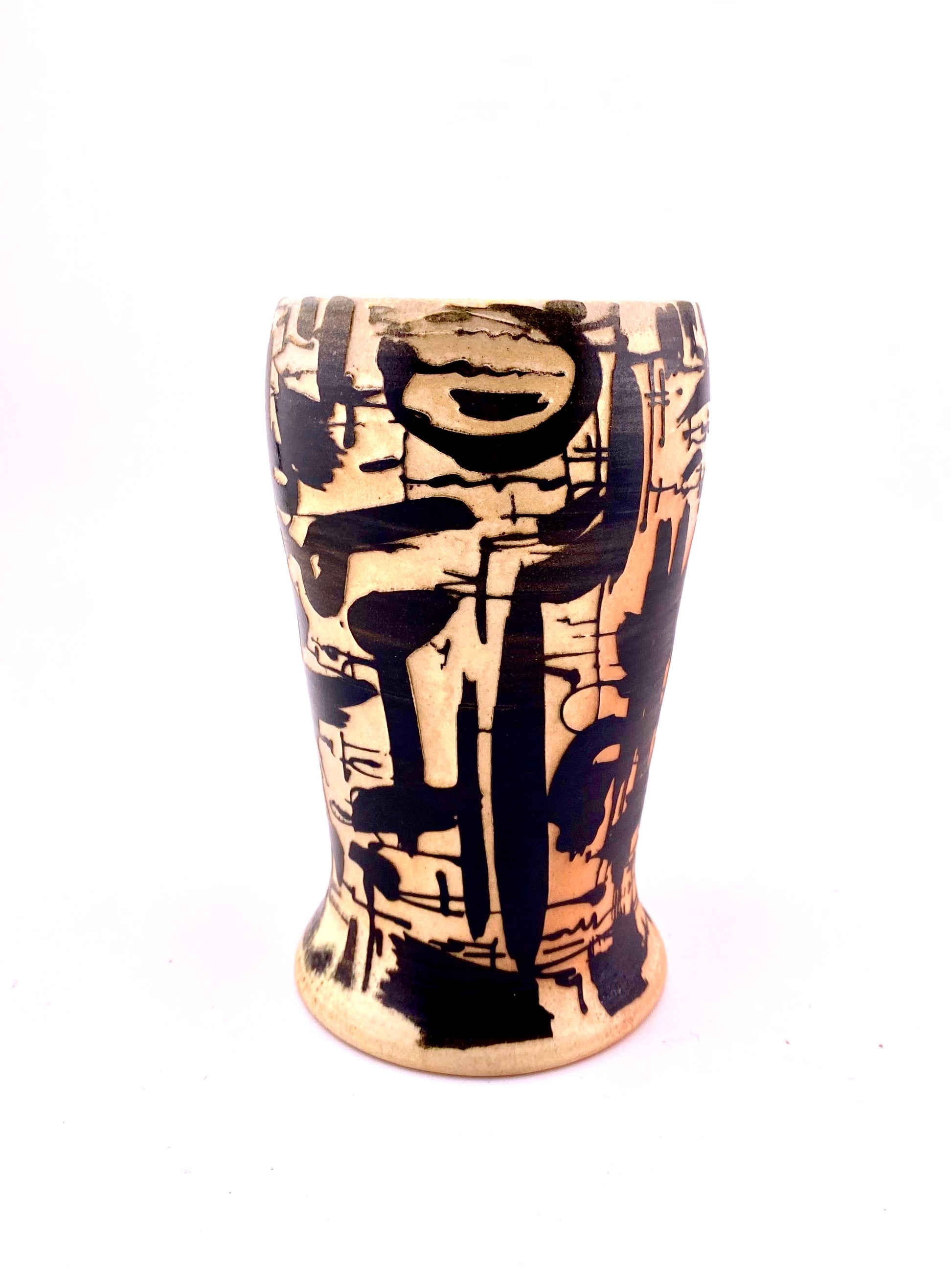 porcelain tumbler with water etched script design. interior glazed, exterior unglazed and finished in wood kiln, then sanded smooth.