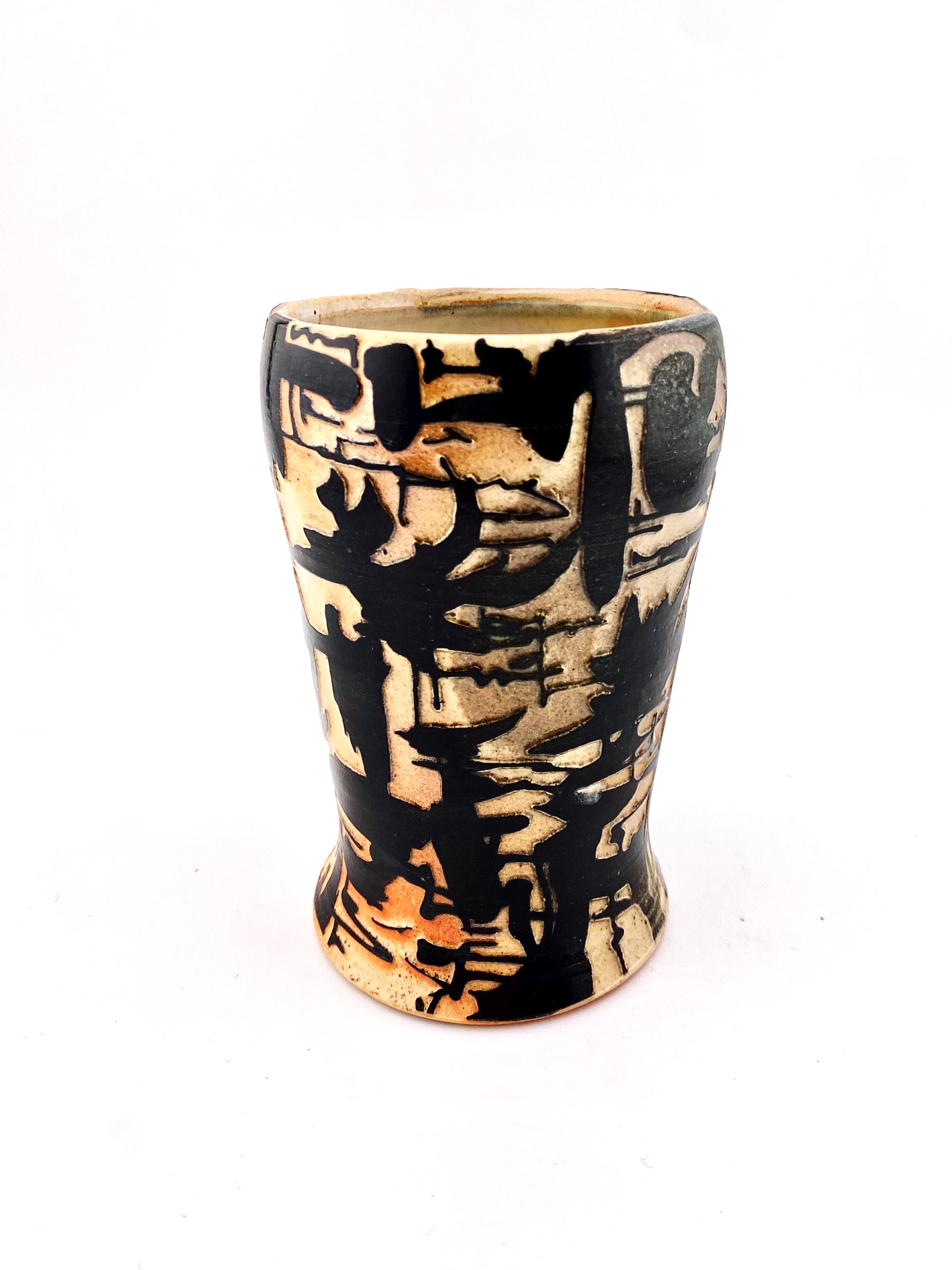 stoneware tumbler with water etched script design. interior glazed, exterior unglazed and finished in wood kiln, then sanded smooth.